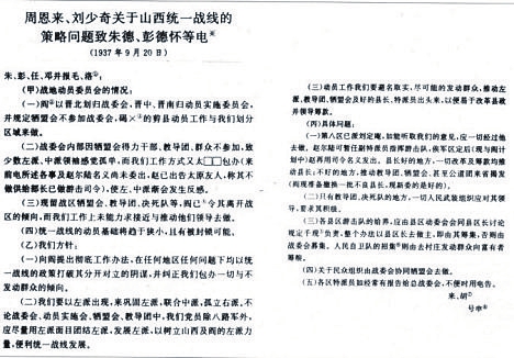 圖1 1937年9月20日,周恩來、劉少奇關於山西統一戰線的策略問題致朱德、彭德懷等電。