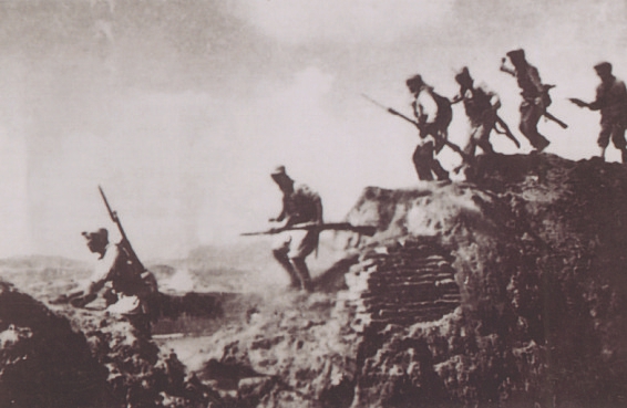 圖12 1938年春,晉西北抗日根據地軍民打退日軍的五路圍攻,收復寧武、神池等7座縣城。圖為部隊在收復寧武縣城戰斗中。