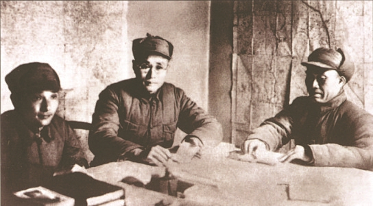 圖9 1937年12月,八路軍第一二九師開辟以太行山為中心的晉冀豫抗日根據地。圖為朱德(右)與劉伯承(中)、鄧小平(左)在研究根據地建設。