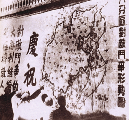 在“擠敵人”斗爭中,晉綏八分區以圍困據點的辦法,“擠”掉伸進交城西部山區的岔口、芝蘭兩個敵據點,打開了山區對敵斗爭的局面。圖為八分區群眾觀看對敵斗爭形勢圖。