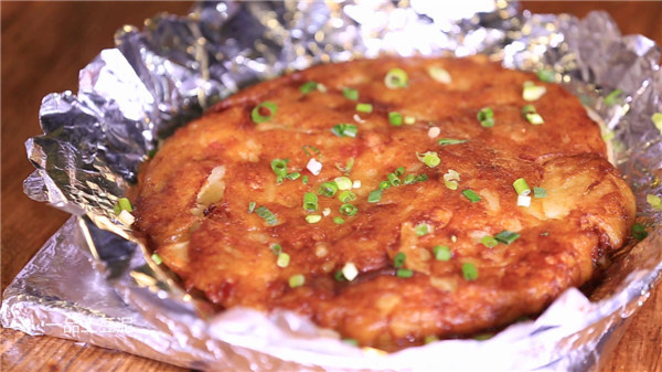 将土豆压成泥,调味,拌入虾仁,制胚,煎至金黄。它的思路来源于西餐的披萨,结合西北本地食材,经过不断研发,改良,如今已成为芙蓉酒楼独创菜品,人气菜。2007年荣获山西省餐饮名店十大金牌菜。