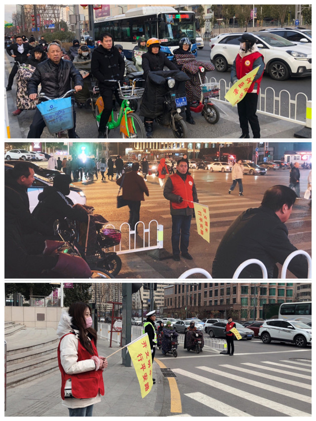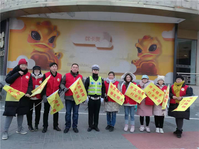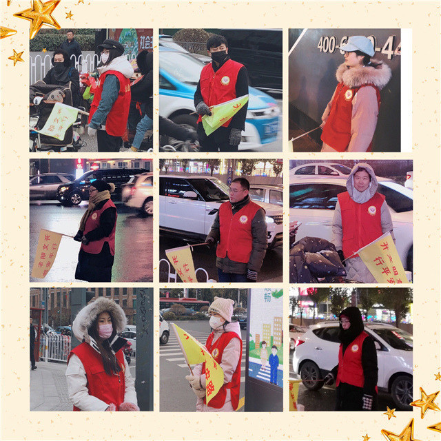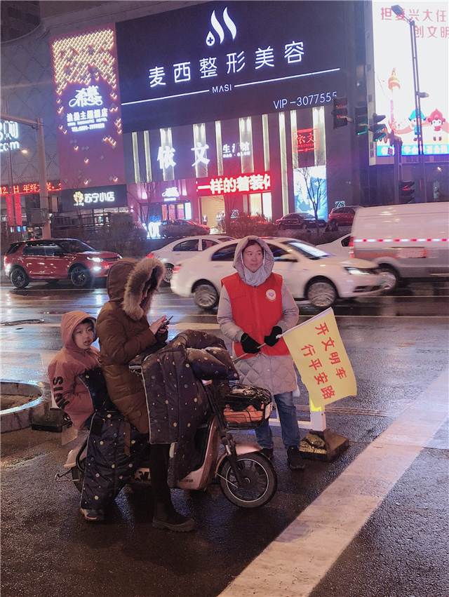 在-9°C的严寒天气下,志愿者们顶着严寒,热情服务。以亲切的微笑、得体的语言,提醒过往行人注意交通信号灯,对闯红灯、乱穿马路的行为进行提醒和劝阻,倡导文明出行。对行人的不理解、不支持等行为耐心劝导,保障市民安全出行。