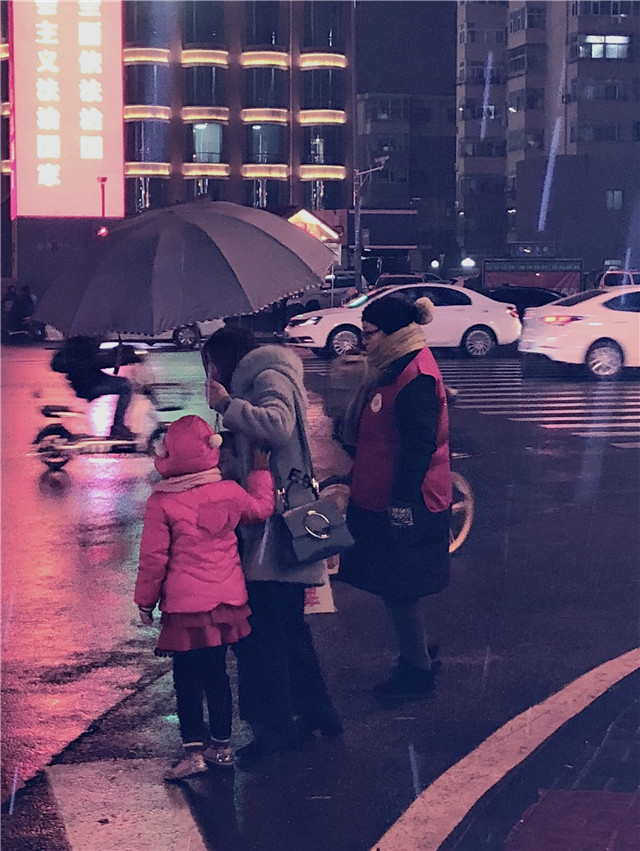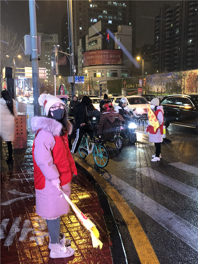 11月29日,天上下起了雪,刺骨寒风迎面吹来,但所有老师没有因为恶劣天气影响了工作热情。即使雪花打湿了外套,寒风吹得冻脚,志愿老师们仍然保持高度的工作干劲,耐心引导指挥。志愿者们严谨的工作态度、良好的精神面貌和文明素养赢得了过往行人的认可和点赞。