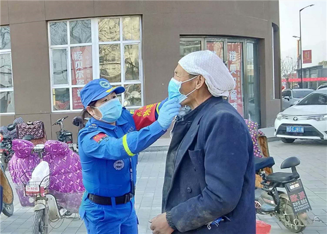 平安志愿者在大街上给个别没有戴口罩的群众戴口罩