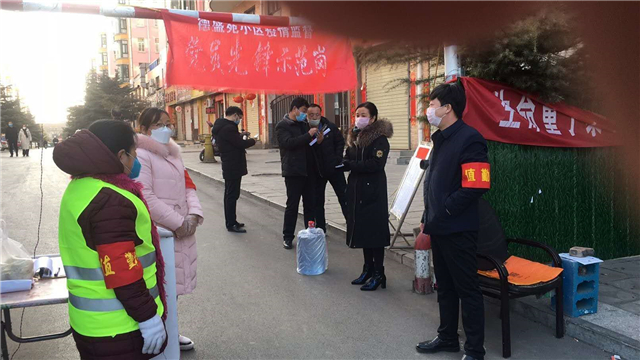 网格长、网格员、平安志愿者在小区检查点执勤对出入人员检查