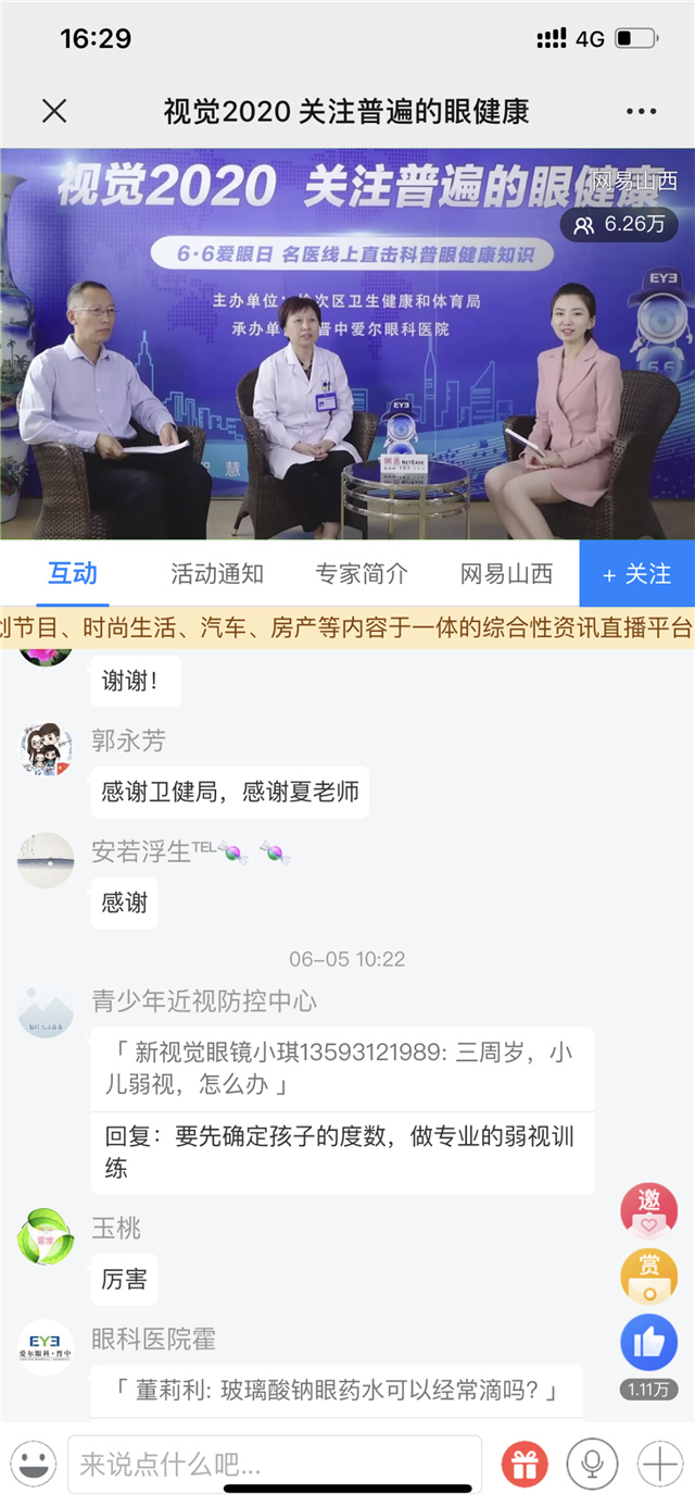 2020年6月6日是第25个全国“爱眼日”。为了积极开展好第25个全国“爱眼日”宣传工作,6月5日上午,晋中市榆次区卫生健康和体育局联合晋中爱尔眼科医院开展了线上眼健康科普直播活动,晋中电视台、网易、今日头条、人民日报客户端等媒体同步直播此次活动,6万余人在线观看。