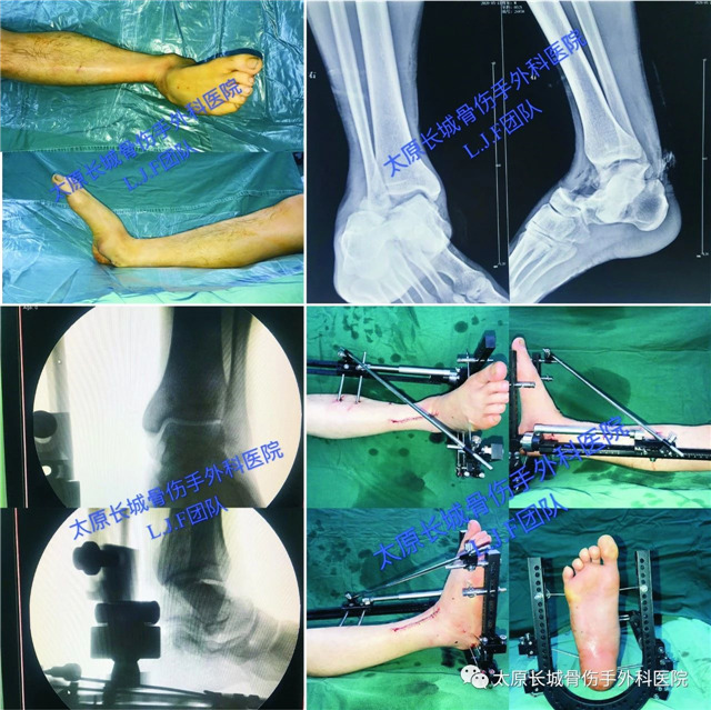 患者霍xx,男,32岁。主因高处坠落致右足出血、畸形8小时于2020-5-13日急诊入院。查体:一般情况可,心肺腹无异常。右足呈跖屈内翻位畸形,踝前外方突起,足踝关节活动障碍。内踝后侧有一约4.0cm斜行伤口,足趾末梢毛细血管回充盈缓慢,皮温低,足底感觉减退。X光片示:胫距关节脱位,距跟、距舟关节脱位。急诊行手术治疗,清创后试行手法复位失败,术中见距骨脱出,胫后肌腱、趾长屈肌腱卡压于距骨颈外侧,踇长屈肌腱卡压阻挡复位。胫后动脉及伴行静脉断裂,胫后神经不全断裂,约5.0cm挫伤。在重建外固定支架辅助牵引下,牵开卡压的踇长屈肌腱,逐渐使距骨复位,组合式重建外固定支架固定。吻合胫后动脉及伴行静脉,修复胫后神经。探查踝关节上胫前动脉见有约4.0cm的挫伤,松解血管外膜。关闭切口。