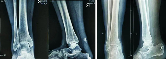 患者贺xx,女,64岁。主因绊倒致右足跟疼痛、行走无力2月余入院。2月前绊倒致右足跟部疼痛、肿胀,自行休养约1周后疼痛、肿胀消退。行走时自觉右足无力感,上坡时明显。当地医院B超检查提示跟腱连续性中断。门诊以跟腱陈旧性断裂收入。40年前有类风湿性关节炎病史,高血压病史20年。检查:右足跟及跟腱部无肿胀,无压痛,跟腱腱性部中央可触及空虚感,提踵试验阳性,Thompson征阳性。X线片:踝关节无异常,跟骨骨刺,踝关节后方皮下有一不规则高密度影。入院诊断:右跟腱陈旧性断裂。入院第3日在腰硬联合麻醉下行右跟腱陈旧性断裂修复术。取跟腱内侧切口,术中见跟骨结节撕脱骨折,骨折块约2.5cm×1.5cm,与跟腱一起回缩4.5cm。术中证实为跟骨结节撕脱骨折。钝性分离粘连跟腱,足跖屈位复位跟骨结节撕脱骨块,克氏针临时固定,锚钉拧入跟骨内,锚钉线缝合固定撕脱骨块和跟腱。