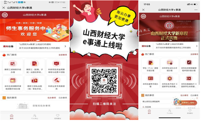 “山西财大e事通”的正式运行,标志着学校师生事务服务工作进入了新的发展阶段,进一步丰富和拓展了学校师生事务服务内容和形式,全面打造了阳光服务大厅线下实体端、师生网上办事平台电脑网络端、掌上办事大厅移动端三大场景深度融合和协同发展的服务模式,构建了全方位、立体化的服务体系。