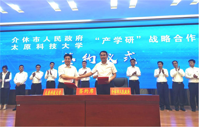 9月19日,太原科技大学与介休市人民政府签订产学研战略合作协议。学校卫英慧校长与介休市张鹏书记、范亮珍市长深入交换了意见,希望学校能够与介休市委、市政府和产业园区不断深化校地合作,在高端装备、新型材料、环境治理、电子信息和互联网等方面实现深入对接,促进“政产学研用”一体化发展。
