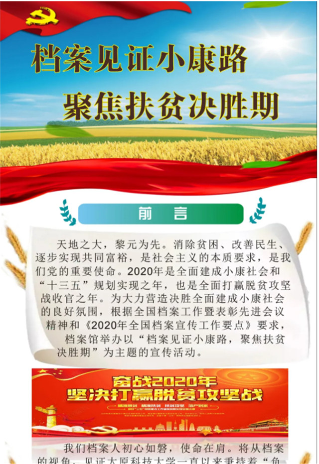2020年是全面建成小康社会和“十三五”规划实现之年,也是全面打赢脱贫攻坚战收官之年。太原科技大学为展示驻汾西县师家沟村与独堆村定点帮扶工作情况,举办了“档案见证小康路,聚焦扶贫决胜期”主题宣传活动。