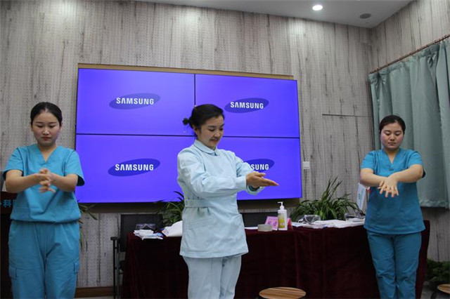 在培训现场,三位医护人员就核酸检测前,医护人员该如何穿脱防护服、如何戴脱防护面具、如何七步洗手法等方面的知识进行了现场示范,双方就疫情防护方面的经验进行了沟通交流。