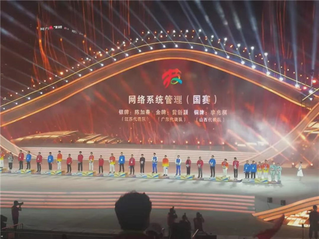 闭幕式邀请来自全国各地各行业的大国工匠、劳动模范、全国技术能手、世赛冠军、特邀代表等作为颁奖嘉宾,为获得本届大赛各项目金、银、铜牌的选手颁奖。来自山西职业技术学院计算机工程系的李兆祺同学代表山西队在“网络系统管理”(国赛精选)项目中斩获第三名,摘得铜牌,并被授予“全国技术能手”称号。