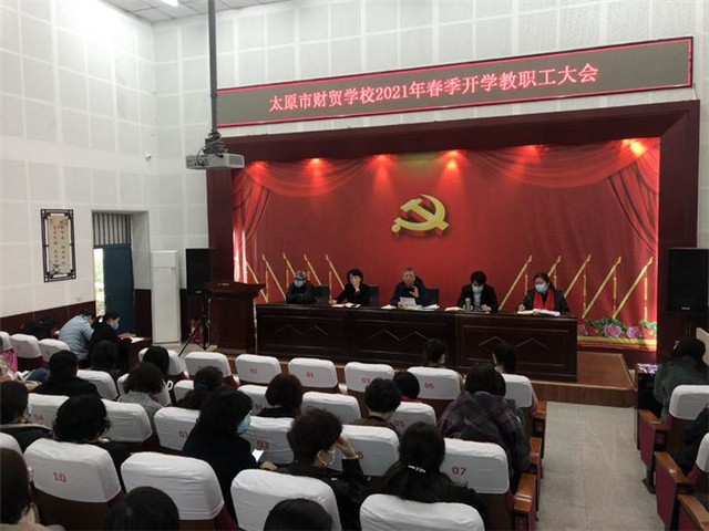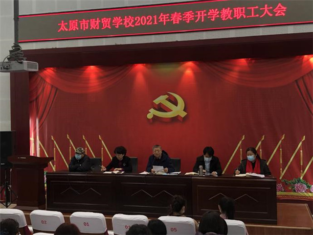 新学期之初,学校各项工作重在立序,只有明晰规划,才能展望未来,成就最美。2月27日上午9点,太原市财贸学校举行了2021年春季开学教职工大会,校长张学锋,党总支书记王秀峰,党总支副书记王彦飞,副校长李保林、郭改莲出席会议,全体教职工参会。大会由党总支书记王秀峰主持。
