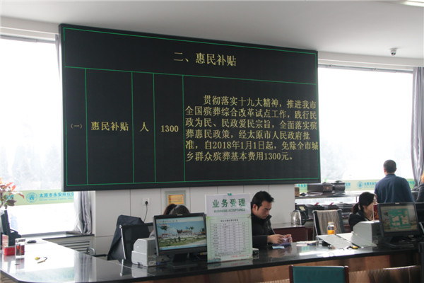 2017年11月,太原市被民政部确定为全国殡葬综合改革试点城市之一,永安殡仪馆面对改革创新重任,力求再创新、再突破,探求新路子新举措,以满足群众需求为导向,继推出一对一特色便民服务之后,又推出多项免费特色守灵间服务。在遗体接收处,服务人员身穿礼宾制服,手带白色手套,引导着逝者家属办理相关手续。该守灵间服务(礼宾迎灵、礼宾停灵引导、礼宾出殡引导、礼宾护卫保障)是一对一便民服务的升级和补充,更有效地将便民引导服务扩大到整个丧葬活动中。