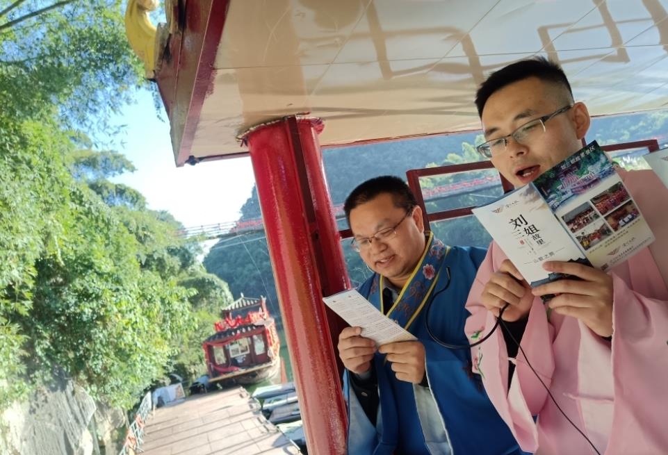 来到流河寨,最吸引人的莫过于亲自参加对山歌和观看民俗表演。当天下午,在乘坐游船前往刘三姐故居途中,当地歌王传授歌谱,教会扮成“莫老爷”和“秀才”的采访团成员如何与“刘三姐”进行对歌。这边唱来那边和!欢快的歌声回荡在美丽的下枧河河谷,引得众多游客拿起手机记录。