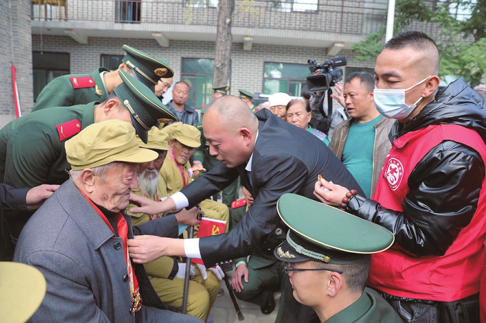 临县志愿者协会党支部携手多个党支部开展“我帮抗美援朝老兵圆个梦”大型主题党日活动,为老党员佩戴党员徽章。图片由临县志愿者协会提供