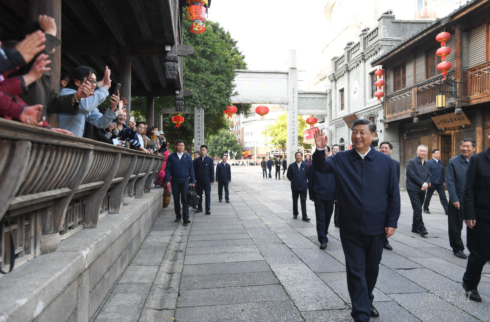 ↑2021年3月24日,习近平在福建省福州市三坊七巷历史文化街区考察时,向游客和市民招手致意。