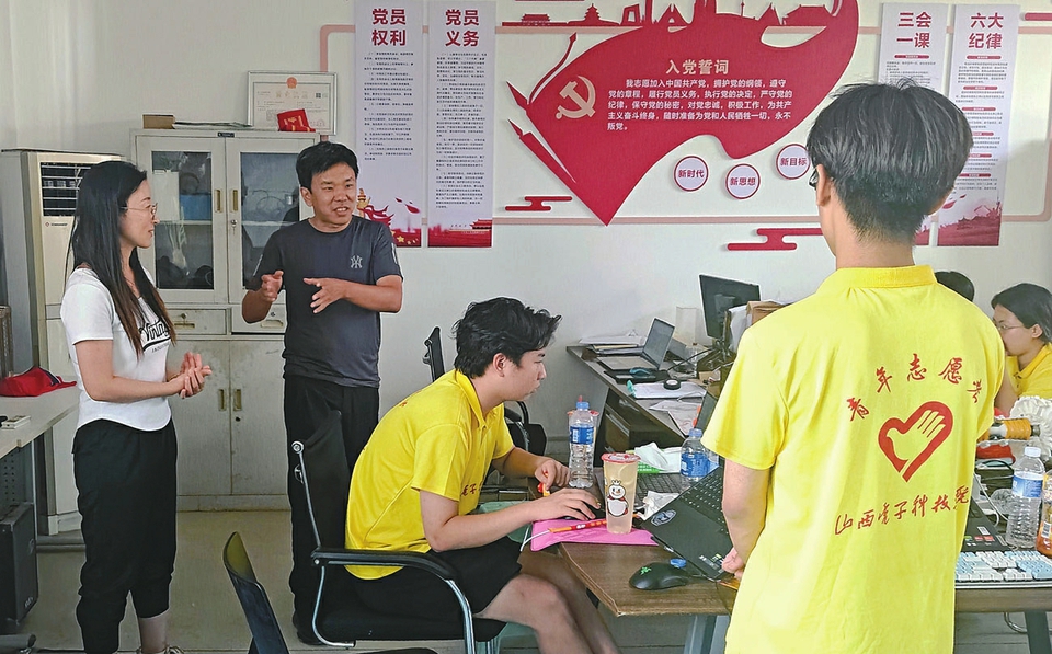白冰(左二)指导大学生开展暑期社会实践。本报记者张志刚摄