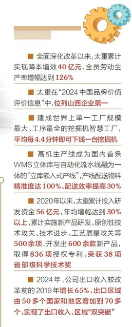 “目前,太重的轨道交通、矿山设备、起重机、工程挖掘机、工程起重机等产品在共建‘一带一路’国家持续热销,在海外市场打造出太重品牌的闪亮名片。”太重国际销售公司总经理石磊介绍,“2024年,公司出口收入较改革前的2019年增长65%,出口区域由50多个国家和地区增加到70多个,实现了出口收入、区域‘双突破’”。
