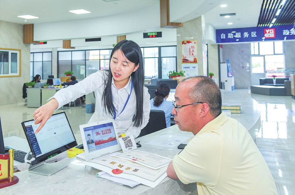 阳高县政务服务大厅工作人员正在帮助企业负责人办理业务。本报记者翁剑摄