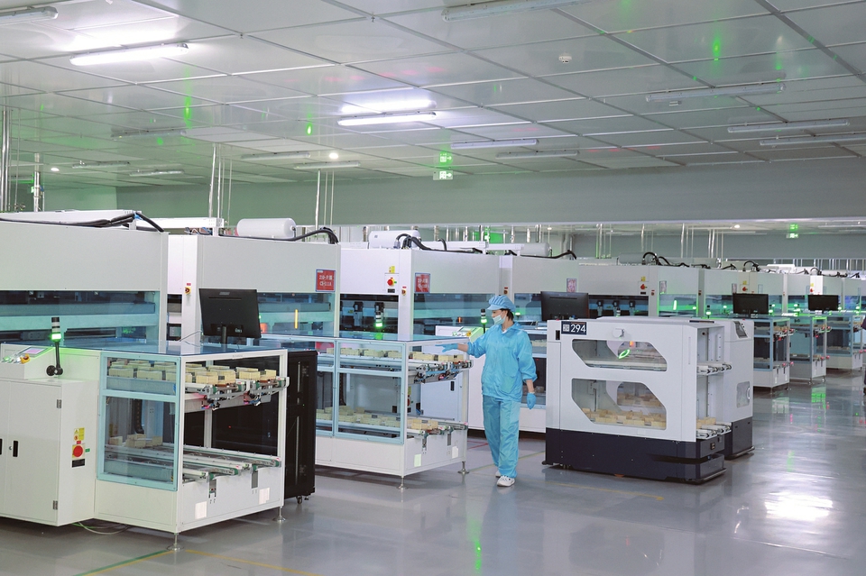 6月14日,在忻州经济开发区光伏产业园一道新能源科技(忻州)有限公司生产车间内,智能机器人与精密设备协同作业,AGV智能小车穿梭其间,准确完成物料搬运任务,展现了现代科技与传统制造业的深度融合。一道新能源科技采用“AGV运输+机器人取片+在线AOI检测”的全自动化生产模式,从原料开盒到产品包装实行全程无人化、自动化生产。这种模式不仅提高了生产效率,也大大减少了人为错误,确保产品的高质量和一致性。“公司拥有600台左右AGV智能小车,1000多台六轴机器人,实现了全自动化生产模式。”一道新能源科技(忻州)有限公司行政经理赵婉朱介绍,“作为园区‘链主’企业,我们主要生产TOPCon光伏电池,技术已发展至4.5代,批量电池效率达到了26.7%,电池开路电压达到了742mV,处于国际领先水平。这些高效光伏电池不仅满足了国内外市场的需求,也为全球绿色能源供应贡献了力量。”