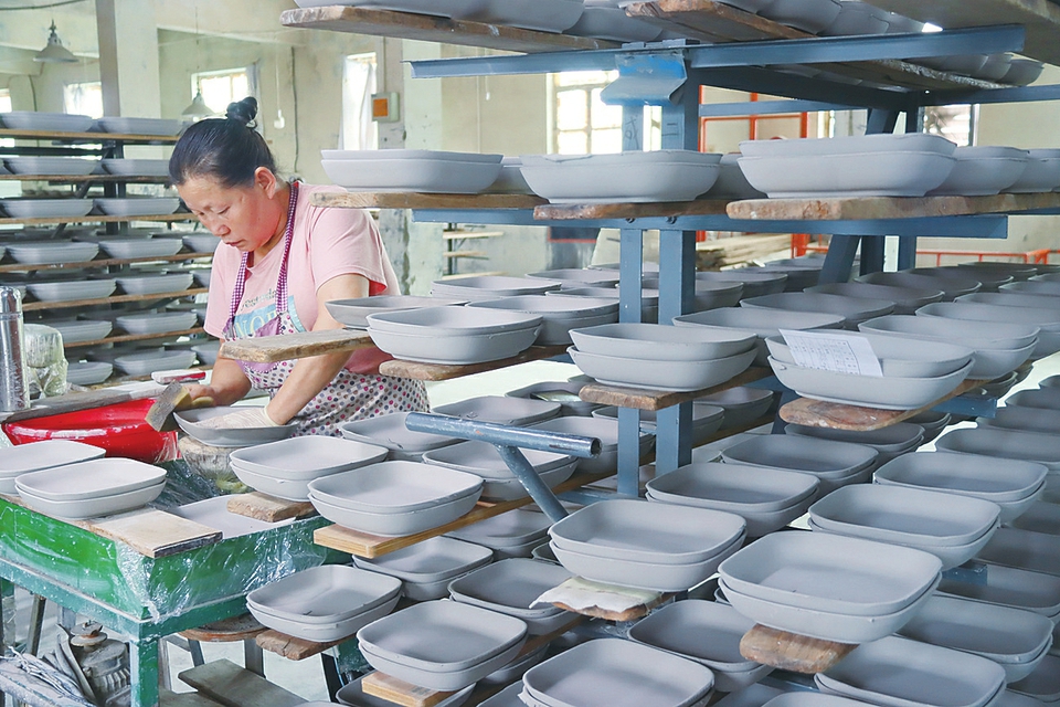 8月12日,阳城县旭昇陶瓷科技有限公司成型车间工人正在洗坯。近年来,该公司将现代科技和传统工艺相结合,提升自主品牌竞争力,先后获得专利31项,企业订单充足、产销两旺。