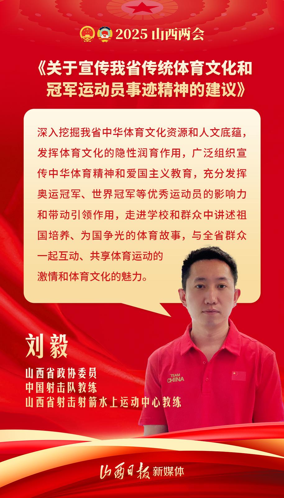 山西日报客户端报道 奏响体育文化强音,凝聚民族向心力。2025年山西省两会期间,山西省政协委员、中国射击队教练、山西省射击射箭水上运动中心教练刘毅上交了题为《关于宣传我省传统体育文化和冠军运动员事迹精神的建议》的提案。