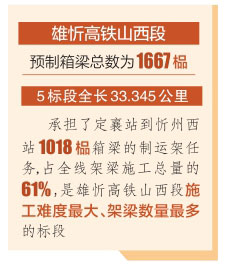 雄忻高铁山西段预制箱梁总数为1667榀,其中5标段全长33.345公里,承担了定襄站到忻州西站1018榀箱梁的制运架任务,占全线架梁施工总量的61%,是雄忻高铁山西段施工难度最大、架梁数量最多的标段。