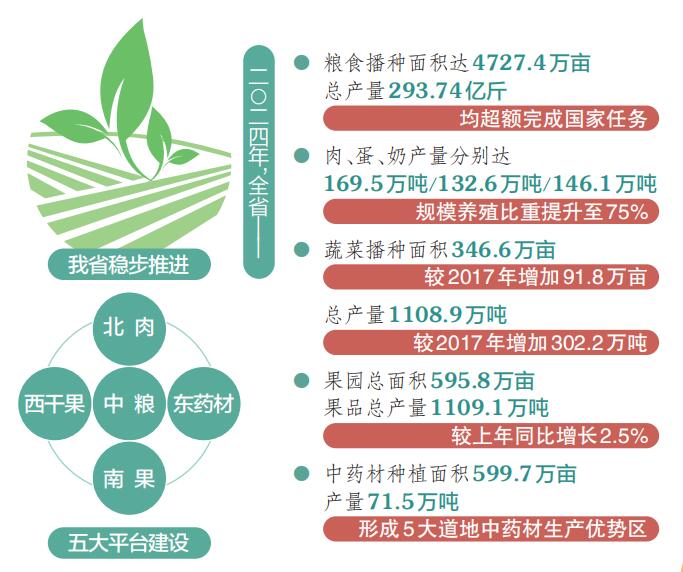 扎实推进五大平台建设让农产品“畅起来”。按照全省域布局、全要素集聚、全产业推进的要求,我省稳步推进“南果、中粮、北肉、东药材、西干果”五大平台建设。2024年,全省粮食播种面积达4727.4万亩,总产量293.74亿斤,均超额完成国家任务。其中:南果平台连续7年成为我省农产品出口第一大平台;中粮平台已建成国家级杂粮生产基地6个;北肉平台产品分销至全国31个省(区、市)及省内30多家企业;东药材平台形成中药饮片、中成药、药食同源产品等9大类500余种产品体系;西干果平台国内交易平台与跨境出口平台均已建成运营。