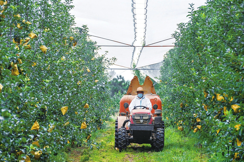 吉县苹果标准化种植基地,工人在机械作业。闫锐鹏摄