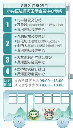 太原市将在山西文博会期间开通5条免费公交接驳专线。其中,4条市内直达潇河国际会展中心的专线,分别从九丰路公交总站—万象城(北向南新晋祠路长兴北街口公交站)—潇河国际会展中心;胜利桥东公交总站—敦化坊(北向南建设北路敦化坊公交站)—山西大学(北向南坞城路山西大学公交站)—潇河国际会展中心;火车南站西广场公交站—潇河国际会展中心;西桥地铁站B站口—潇河国际会展中心。运行时间为市内至潇河方向8:00—15:00,潇河至市内方向10:00—18:00。此外,为便于驾车自行前往的市民出行,还开通了1条社会停车场至山西潇河国际会展中心的免费接驳线路。该线路从先行路潇河大街口经先行路至会展中心往返运行,在智慧南街口、先行路乐商街口停靠,运行时间为9:00—18:00。