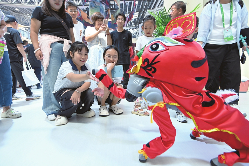 8月21日,长治展区,游客正与黎侯虎装扮的机器狗互动。本报记者赵夏雨摄