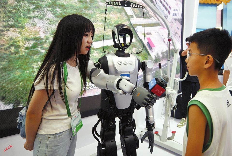 5.山西晚报·山河+记者陪着山西晚报·山河+机器人记者与小朋友互动。
