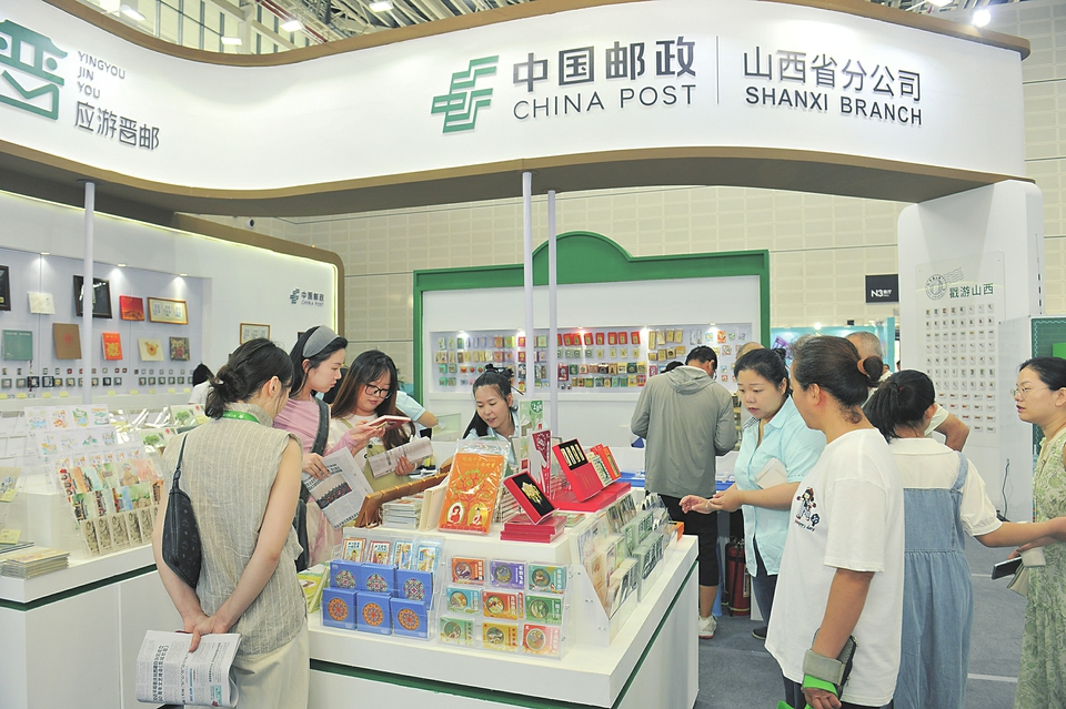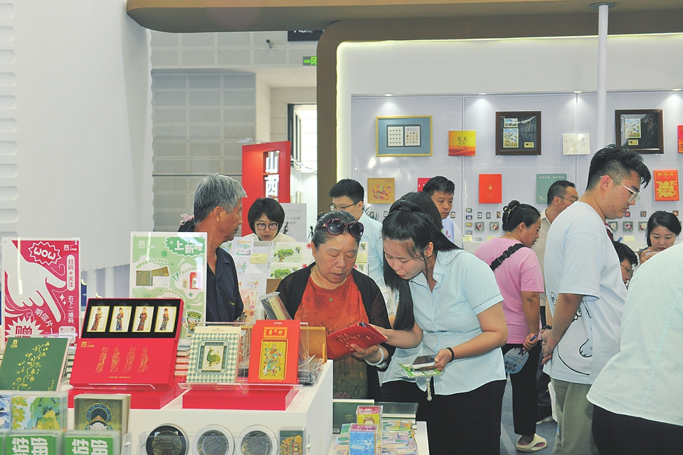 观众在中国邮政山西省分公司展区选购文创产品。