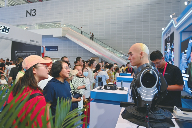 ④蒂艾斯科技展区内,市民正在跟智能机器人互动。本报记者范文静摄