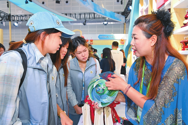⑦非遗代表性传承人张丽娜向参观学生介绍牵绣制作技艺。本报记者申晋光摄