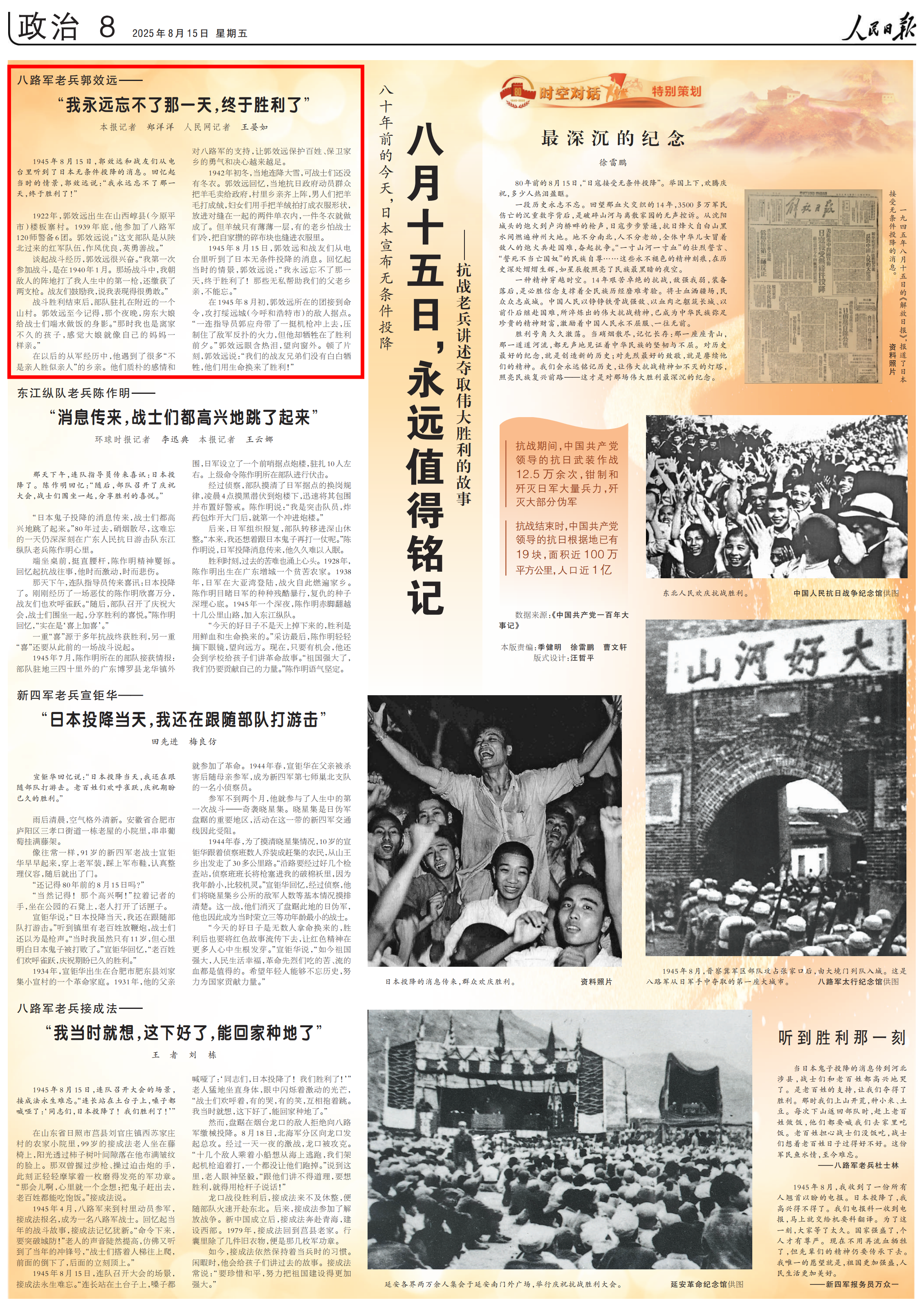 《人民日报》2025年08月15日第08版 一九四五年八月十五日的《解放日报》,报道了日本接受无条件投降的消息。 日本投降的消息传来,群众欢庆胜利。