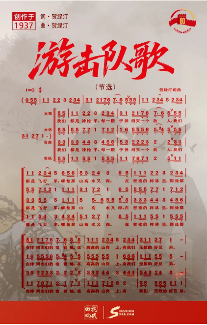 ▲点击海报听抗战歌曲 “我们都是神枪手,每一颗子弹消灭一个敌人。我们都是飞行军,哪怕那山高水又深……”每当这段旋律响起,总能瞬间唤醒中国人心底的集体记忆——这便是由贺绿汀创作的《游击队歌》。