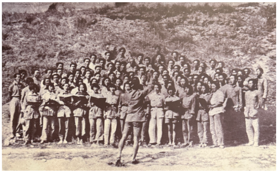 1940年,在下北漳村村边小河旁那片梨花盛开的树林中,前方鲁艺与抗大总校文工团联合排练《黄河大合唱》