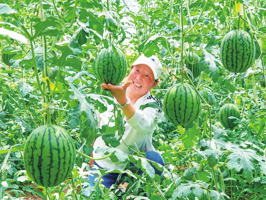 平陆县关家窝村吊蔓西瓜喜获丰收。闫鑫摄