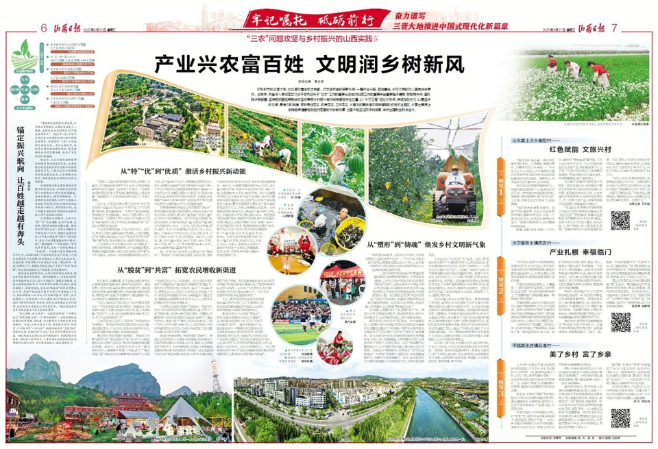 扎实推进乡村振兴,山西立足“特”“优”农业禀赋,走出产业强、农村美、农民富的融合发展之路。粮食安全是“国之大者”,去年山西粮食总产量达293.74亿斤,超额完成国家任务,今年更以粮食单产提升工程为抓手,在20个县开展整建制单产提升,推广“膜侧播种+”“浅埋滴灌+”等有机旱作技术,让每一寸耕地都成为“丰收田”。产业振兴是乡村振兴的重中之重,山西新创建2个国家现代农业产业园、1个国家优势特色产业集群,培育省级以上龙头企业1039家,打造高粱、中药材等9个百亿级产业链,“有机旱作・晋品”品牌从广州、成都走向全国,既让“土特产”变身“金招牌”,更让农民深度融入产业链条,分享发展红利。