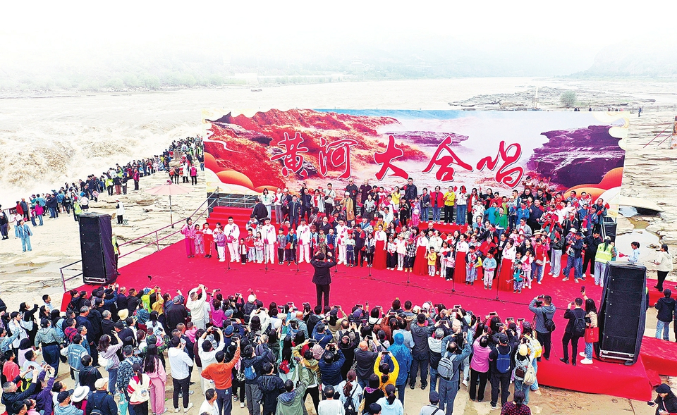 10月1日,游客在吉县黄河壶口瀑布景区同声高唱《黄河大合唱》。吕桂明摄