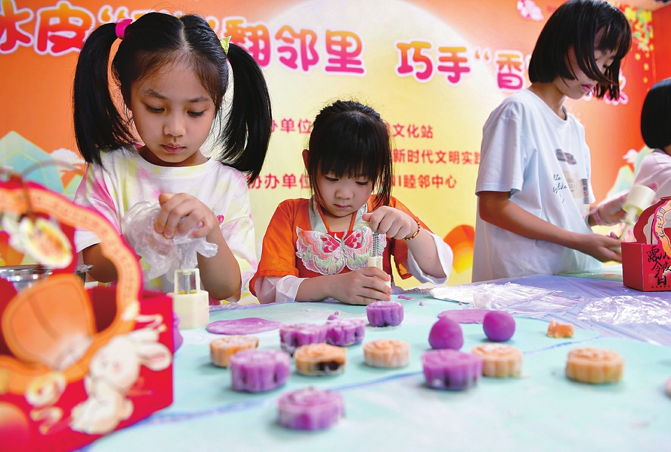 ②10月5日,在江苏省无锡经开区太湖街道方庙社区举办的迎中秋主题活动上,小朋友体验制作月饼。