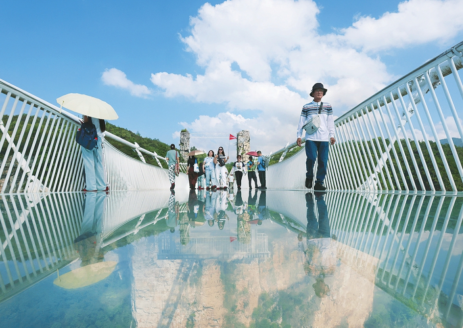 ④10月5日,游客在湖南张家界大峡谷景区高空玻璃桥上游览。