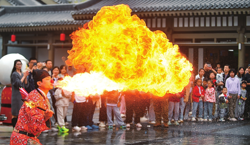 ①10月5日,在河南省洛阳市洛龙区龙门古街景区,民间艺人为游客表演喷火。