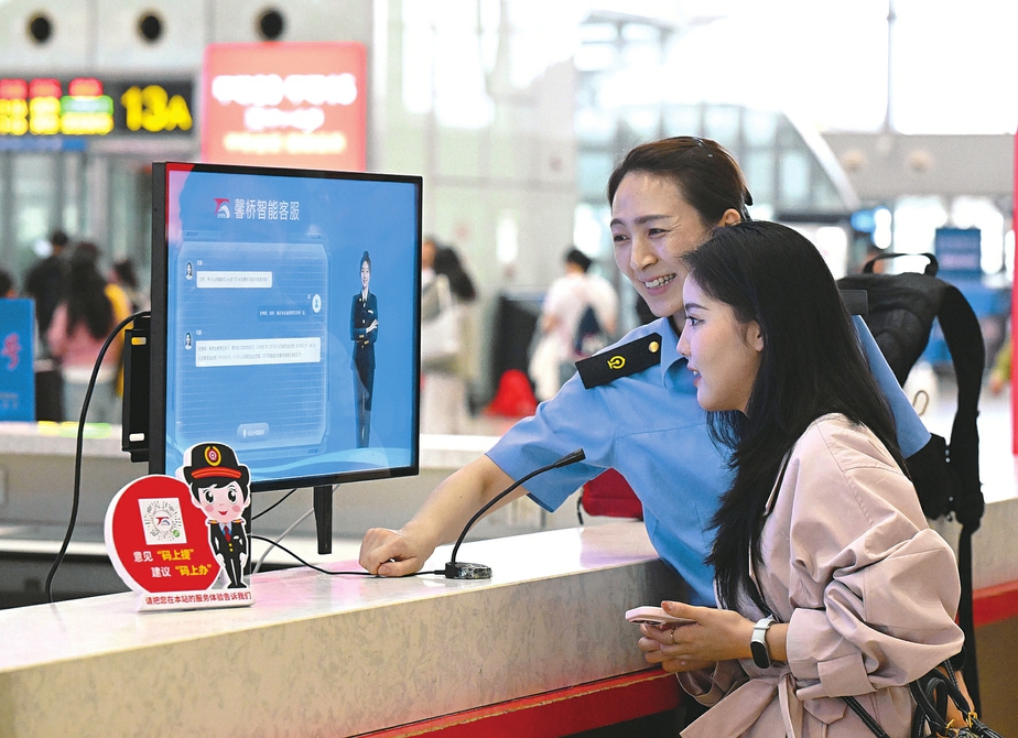 ③10月5日,在河北石家庄火车站候车大厅服务台,旅客向“AI智能客服机”问询旅行信息。