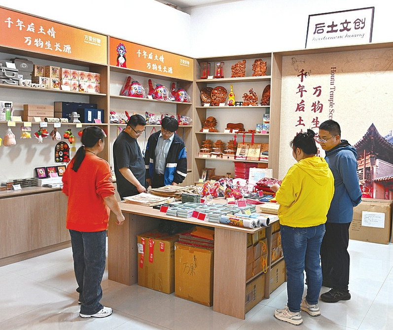 10月5日,万荣县后土祠景区游客服务中心,游客们正在挑选特色文创产品。王若渊摄