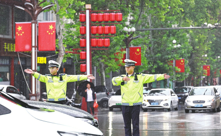图②10月6日,新绛县交警大队古城中队两名辅警冒雨指挥交通,保障市民安全通行。 高新生摄