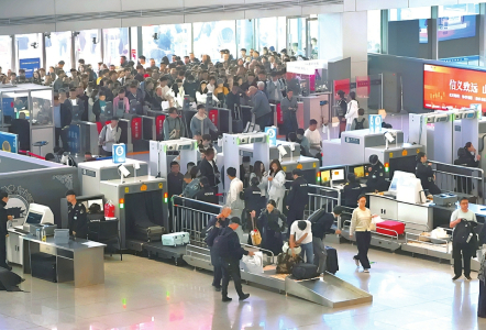 图④10月4日,太原南站,旅客正有序通过安检。站内工作人员各司其职,以贴心服务为乘客创造安全有序的环境。本报记者申晋光摄